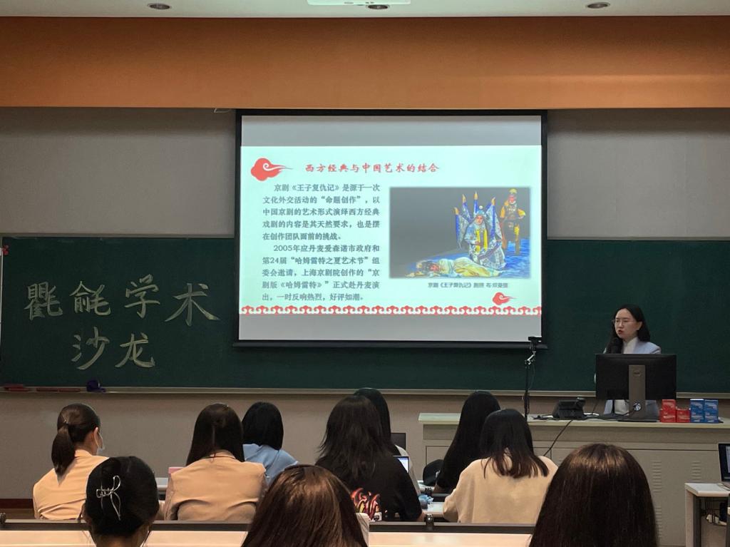 在此次讲座的预热活动“京剧《王子复仇记》观赏会”中,文学院讲师杜雪老师为同学们讲解了京剧《王子复仇记》的内容和艺术特色。参与活动的师生一边观看、一边评赏,结束后交流问答,在轻松愉快的沙龙氛围中,增加了对戏曲戏剧的了解与研究兴趣。