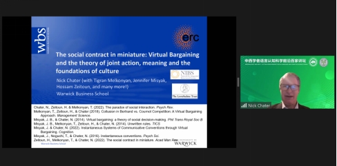 英国华威大学Nick Chater教授报告题目为“社会契约的缩影:虚拟契约与联合行动、意义和文化基础理论”。他着重探讨了人际间联合行动的灵活程度、符号如何获得意义、社会为何正常运转而不崩溃以及社会契约的起源,对虚拟契约在认知和社会发展中的作用提出了深刻的见解。