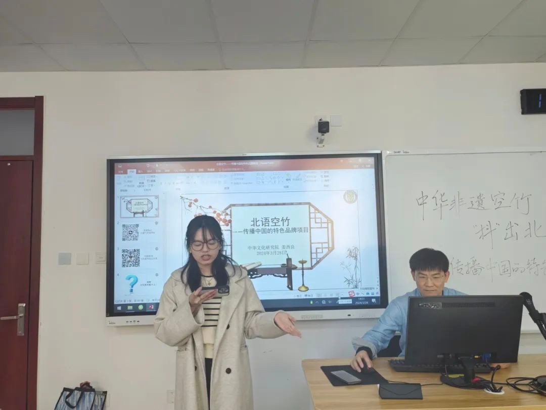在有“小联合国”之称的北语开展空竹运动,能够增强中外学生体育素质和身体能力、传承非遗传播中华优秀文化、促进中外交流,意义重大。北语能够采取公选课、体能训练项目等多种形式鼓励学生参与学习空竹,并依托北语世界文化节的空竹表演体验,吸引更多学生了解空竹,传承空竹文化。姜老师还为大家播放了去年世界文化节中飞天空竹社的表演视频,精彩的表演获得现场师生一众好评赞叹。