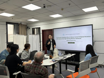 在研讨会中,基地研究生积极参与并分享个人研究。在首场研讨会中,博士生郝元元做题为“How conventionality, context, and working memory influence Chinese metaphor processing: Evidence from ERP”的报告,她从研究背景、当前问题和方法论三个方面分别阐述,并提出研究假设和实验方案。硕士生陈心怡报告 “Does Word Order Background Affect Chinese L2 Learners' Non-canonical Sentence Comprehension?——An fMRI study”,通过两个递进实验,探究二语学习者的母语背景对他们理解汉语非规范句的影响。硕士生王琼做题为“The Influence of Contextual Information on Metaphorical Processing Mechanism”的报告,介绍利用fMRI技术探究包含目标域特征和源域特征的语境对于汉语母语者隐喻理解的影响。在第二场研讨会中,博士生王慧萍报告了“The Neural Mechanisms of Fossilization in Chinese L2 Learners' Syntactic Processing”,对“僵化(Fossilization)”,对“关键期(Critical Period)”和“内隐、外隐学习(Implicit and Explicit Learning)”等概念进行介绍,指出现有研究存在的问题,并提出研究设想和计划。硕士生林琳报告题目为“A Study on the Neural Mechanisms of Auditory Modalities in Disyllabic Compound Words—An experiment design”,她以汉语复合词为研究对象,运用神经影像分析技术,研究透明度和词频对汉语复合词加工的影响。硕士生解世阳做题为“The effect of the semantic relatedness between disyllable words and their constituents during visual word recognition”的报告,详细介绍实验设计等研究内容。