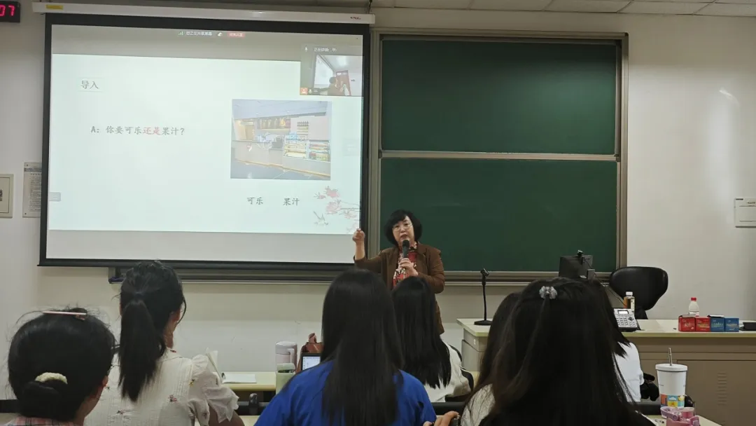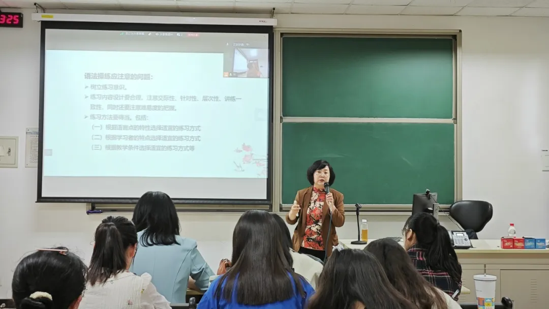 在本次讲座中,苏英霞教授以国际中文语法教学的步骤和理念引入,深入介绍了国际中文语法教学中的九大原则,为在线上和线下师生提供了宝贵的语法教学研究理论成果和实践经验。作为第二语言课堂教学中的语法教学,历来是教和学最重视的内容。如何教好语法,如何学懂会用语法,是广大师生关注的问题。有规矩自称方圆!苏教授首先为同学们介绍了语法教学的“两个环节”和“四个步骤”,然后结合亲身经验和教师培训经历,详细介绍了她所提炼出的国际中文语法教学的九大原则,包括:科学性原则、适用性原则、实用性原则、实践性原则、交际性原则、易懂性原则、趣味性原则、渐近性原则以及语言与文化教学相结合的原则。苏英霞教授认为,实践性原则是这九大原则中的重中之重,其核心是精讲多练。如何做到精讲多练,涉及到一个“三讲”的问题,即“讲不讲”“讲什么”和“怎么讲“”三个问题。苏老师认为,语法要“用不讲的方式讲”,比如可以通过恰当的图片或师生互动方式来替代口头的、机械的语法知识讲解,进而使学生快速进入情境,达到实践性、易懂性、趣味性等原则的有机统一。苏英霞教授还结合多年来的教师培训经历,引导学生们一起分析教学失误案例。
