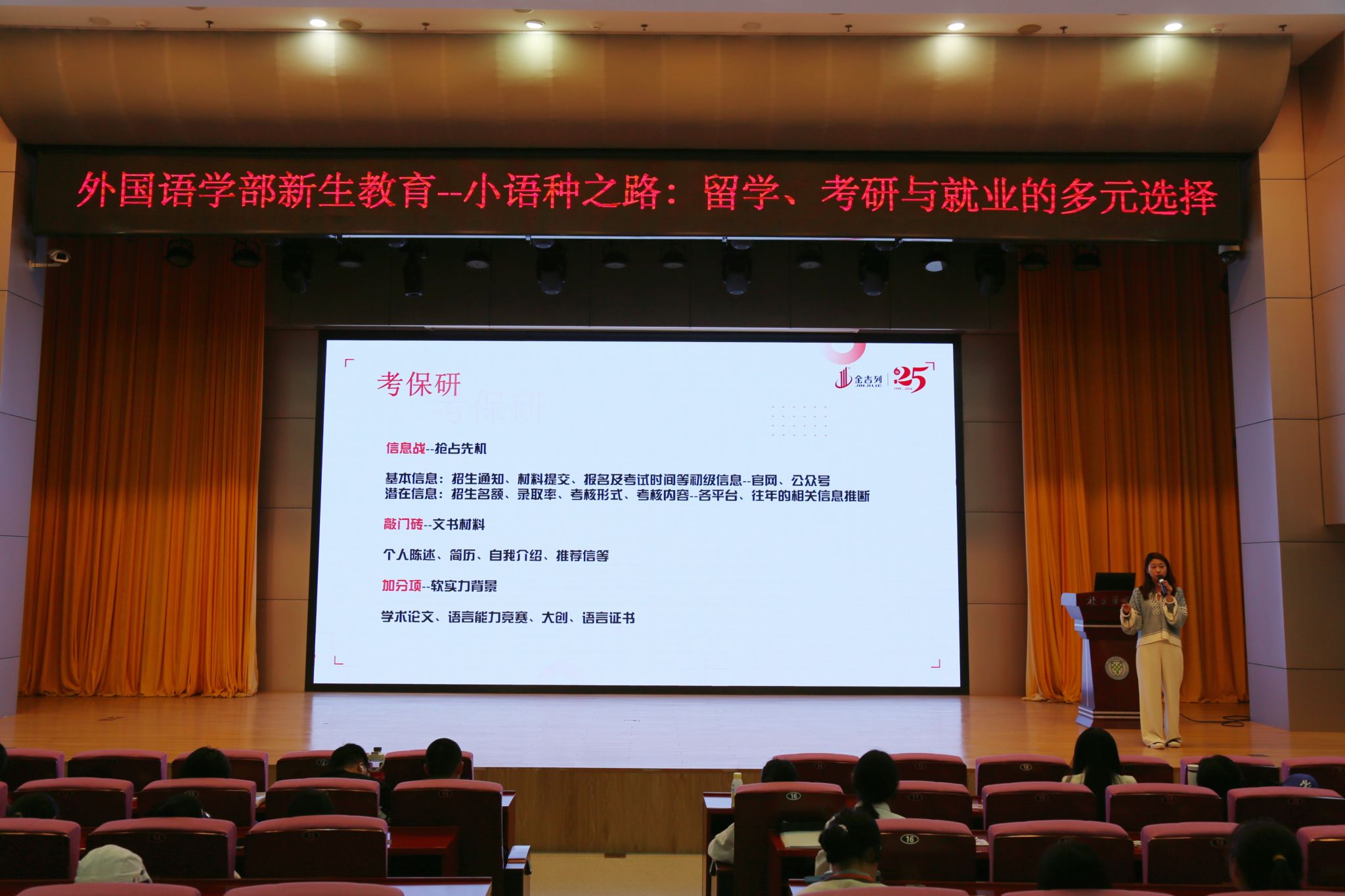 此次讲座吸引了众多外国语学部 24 级小语种新生参与。主讲人分别从考保研、就业、出境留学三个版块深入展开,深入探讨小语种专业的多元发展路径选择。在考保研方面,致力于为学生打破信息壁垒,提供有力的敲门砖与加分项;就业层面,细致剖析了小语种就业的优势与劣势,并通过提出收集信息、拓展社交、提升技能等方面的建议,为学生们开拓了更多的就业选择;而在留学方向上,从留学的意义切入,助力学生明确目标和动机,针对申请要求进行了简要介绍,同时提供了相应国家的留学资讯。