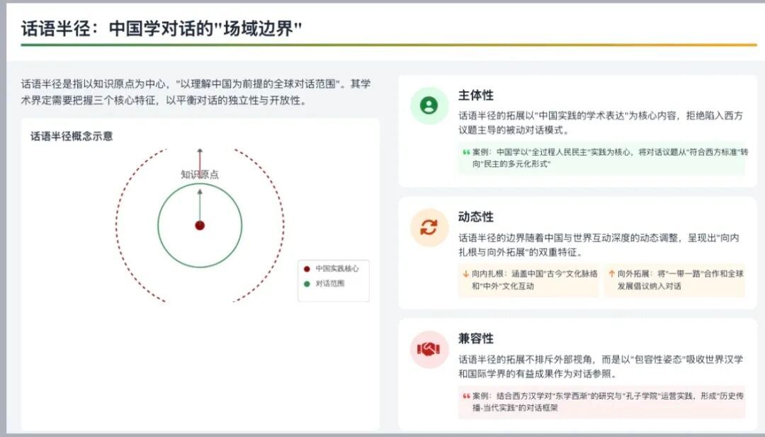 话语半径是中国学以知识原点为圆心,形成的“以理解中国为前提的世界对话范围”,其学术界定需把握三大核心特征,平衡对话的独立性与开放性: