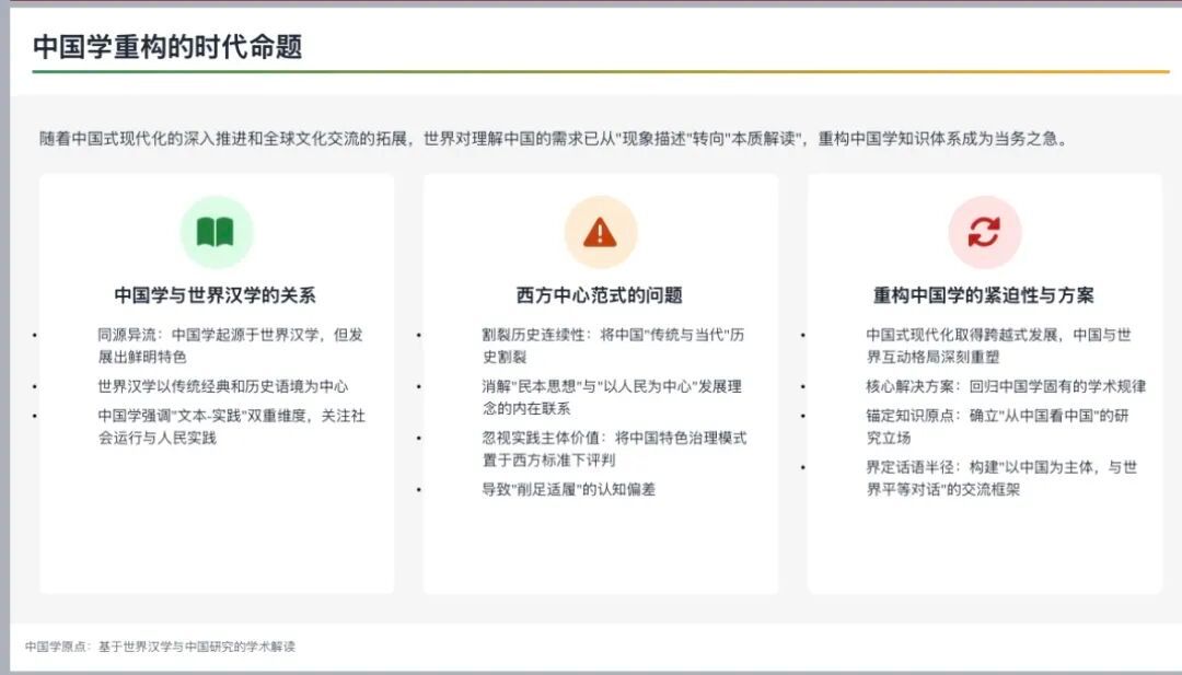 在理性吸纳外部视角方面,中国学需将世界汉学与国际学术的有益成果作为对话参照(而非认知标准)。例如西方汉学家费正清提出的“冲击—回应”模式,虽存在以西方为中心的局限,但其对“西方工业文明与中国传统社会互动关系”的分析,为研究近代中国社会转型提供了对比视角;国际学术界对“全球治理赤字”的讨论,也为分析“人类命运共同体”理念的现实意义提供了问题意识。中国学对这些外部视角的吸纳,是在“以中国为主体”的前提下,通过多元参照更清晰地界定中国实践特质,而非以外部标准修正中国实践,确保对话的独立性。