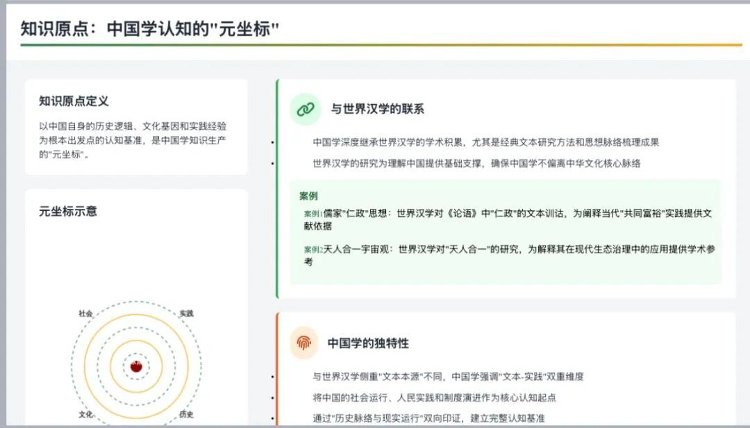 从学术规律层面界定,中国学的知识原点是指以中国自身的历史逻辑、文化基因与实践经验为根本出发点的认知基准,是中国学知识生产的“元坐标”,其核心内涵可从双重维度展开:
