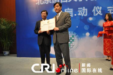 北京语言大学校长崔希亮(左)向翟隽副部长颁发聘书