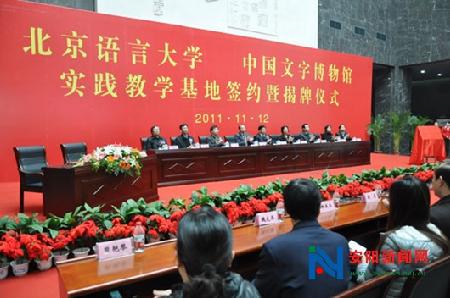 安新网讯(记者 冀坤)11月12日上午,北京语言大学与中国文字博物馆实践教学基地签约暨揭牌仪式在中国文字博物馆隆重举行。市委书记张广智与北京语言大学校党委书记王路江共同为实践教学基地揭牌,副市长刘国辉主持仪式。