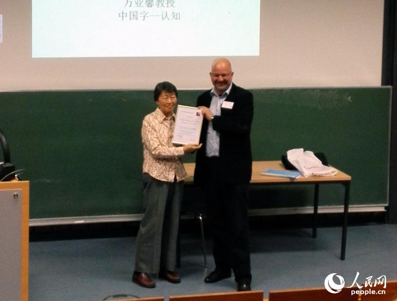德语区汉语教学协会会长顾安达向万业馨(左)颁奖。人民网记者管克江摄