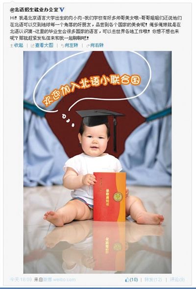 欢迎加入北语小联合国”,昨日,北京语言大学招生形象代言人“肉小肉”,手持该校录取通知书,在北语招生就业办公室和教育部的官方微博亮相。记者了解到,中美混血宝宝“肉小肉”仅11个月大,系北语外教之女。