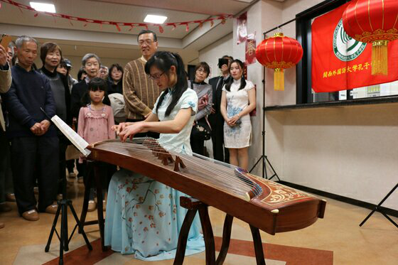 在联欢会的开幕式上,孔子学院院长靳卫卫教授、日中友好协会山中卓会长先后致辞,为所有来宾送上了春节的美好祝福,然后大家欣赏了古筝表演《战台风》和《井冈山上太阳红》,琴声欢快明媚,使人沉醉。最后是令人期待的抽奖环节,嘉宾们为获奖者送出了孔子学院精心准备的新年礼物。