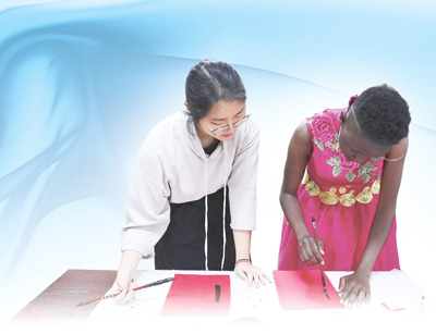 在肯尼亚内罗毕大学孔子学院,当地学生正在中国老师的指导下练习书法。