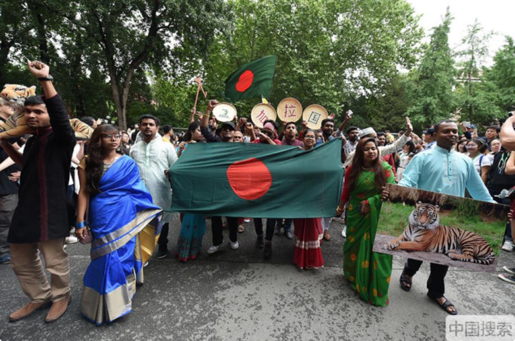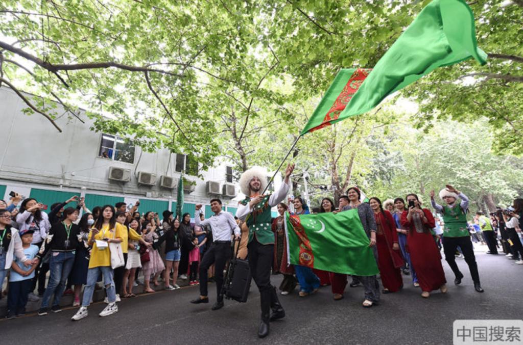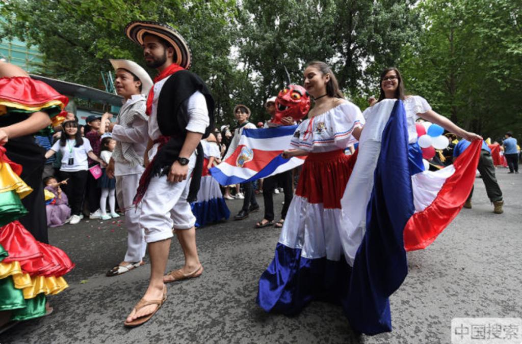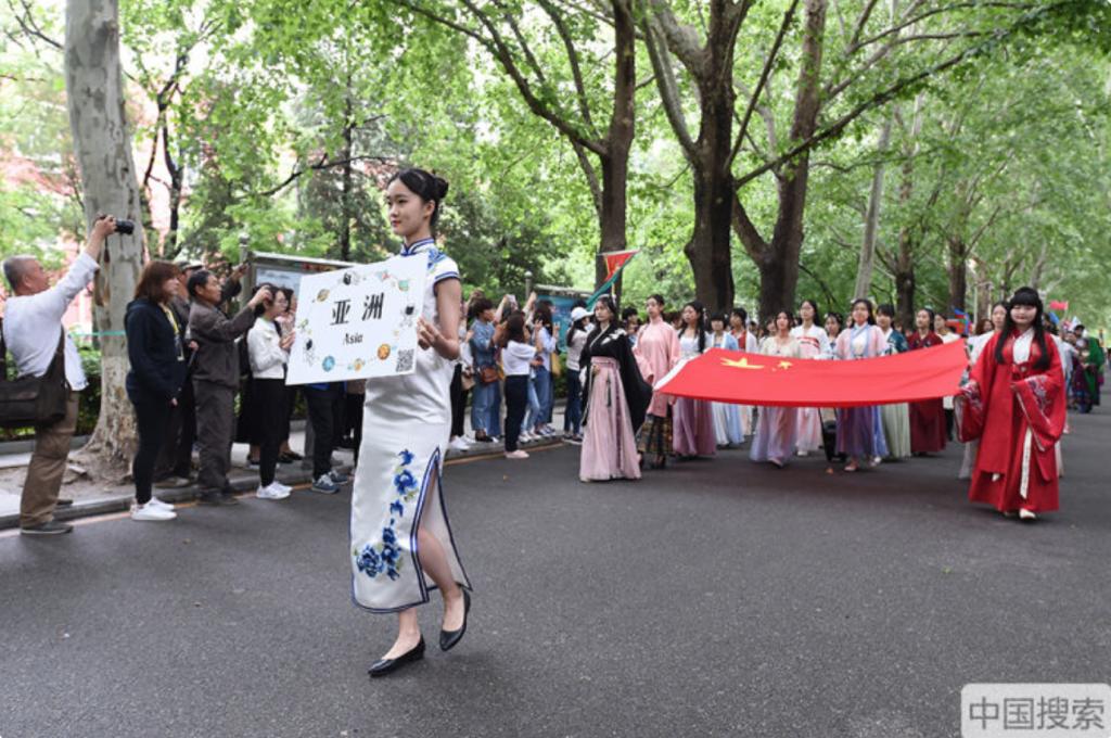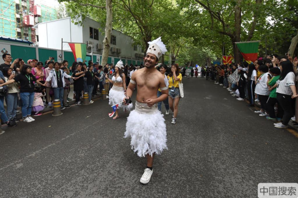 七彩长龙般的万国巡游队伍拉开了世界文化节游园会的帷幕。巡游队伍从北语东门出发,途经梧桐大道,向操场行进。各国留学生身披各具特色的本国传统服装,精心的装扮使他们别具风采,他们或手持国旗,或载歌载舞,尽展青春活力。