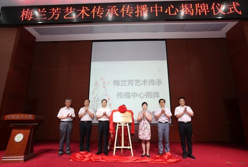 文化和旅游部艺术司副司长周汉萍、非遗司副司长胡雁、北京语言大学校长刘利、北京语言大学中华文化研究院院长韩经太等为梅兰芳艺术传承传播中心揭牌。