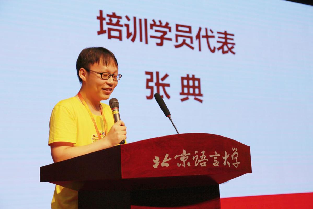 参培志愿者代表张典分享了参培的经验。他首先对北语孔子学院教师培训中心的辛勤培育表示感谢。张典表示,通过此次培训志愿者们深切地了解到“民族责任感”这个词语的重量,感受到了身为汉语教师志愿者的责任感,他相信身为汉语教师志愿者将成为他们终身骄傲的经验与财富。