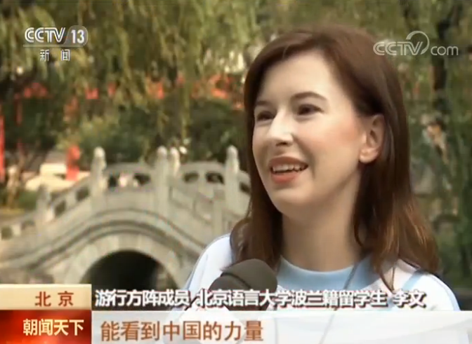 游行方阵成员 北京语言大学波兰籍留学生 李文:(我家人)他们在波兰的,我给他们CCTV的网站,他们就是在这个网站看了直播,他们就看了阅兵的时候,他们觉得特别厉害,能看到中国的力量。