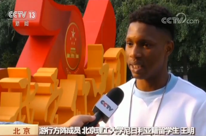 游行方阵成员 北京理工大学尼日利亚籍留学生 王明:我来到中国之前,我没有想过我们人类确实是一家人,但是来到了这里之后,我发现其实不管肤色怎么样,我们都是一家人。我将来生了孩子之后,我的孩子们或者我的孙子,我能够很荣幸地跟他们说,我在2019年在中国参加了方阵,能够庆祝新中国成立70周年(庆典)。(央视记者 马力)