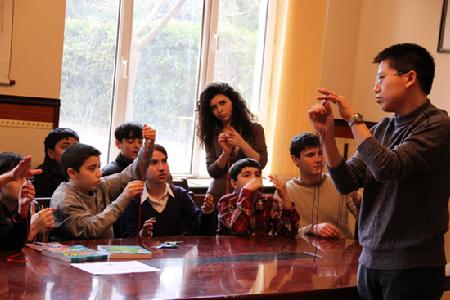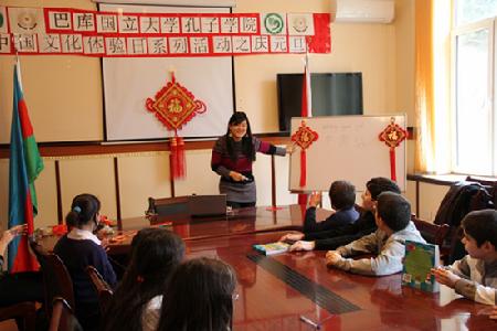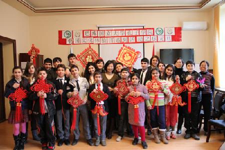 2011年12月24日中午12点,巴库国立大学孔子学院中学生班学员在孔子学院多功能厅齐聚一堂欢庆新年。此次“中国文化体验日”的活动是学编中国结和踢毽子,旨在让学生了解在中国传统文化中中国结的和谐、团结、吉祥、幸福等象征意义,并亲身体验如何编出好看的中国结。共计三十余名中学生及家长参加了此次活动。