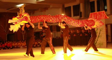 “运动之夜”是泰国大学学生们自己的盛会,每年举办一次。宋卡王子大学素叻塔尼校区的运动之夜晚会从12月3日晚7点一直持续到深夜12点,历时四个半小时。全校将近三千名学生参加了这场盛会,参与表演的学生高达约五百人。晚会上泰国学生用自己的方式展现了中国风情:龙是中华民族的图腾,是权力、威严和吉祥的象征,泰国学生通过表演舞龙,表达了他们对“龙”文化的理解和喜爱;在背景设计上采用了中国的对联——“不到长城非好汉,学好汉语闯天下”,将中国谚语和孔子学院汉语推广口号“学好中国话,朋友遍天下”相融合。此外,泰国学生们还通过展示中国传统服装,表达了对中华民族美学理念的理解和喜爱,让更多人感受到中国仪态万千的服饰美。