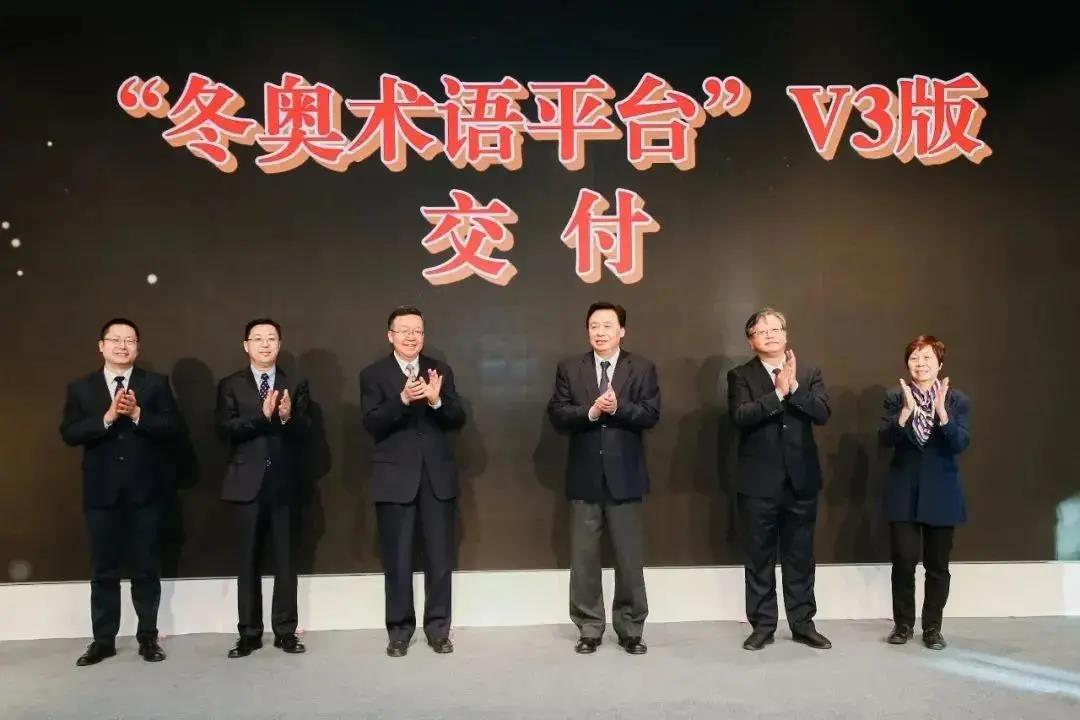 田学军副部长、杨树安主席、刘利校长、顾青书记、裴亚军主任、刘和平教授共同启动冬奥术语平台V3版