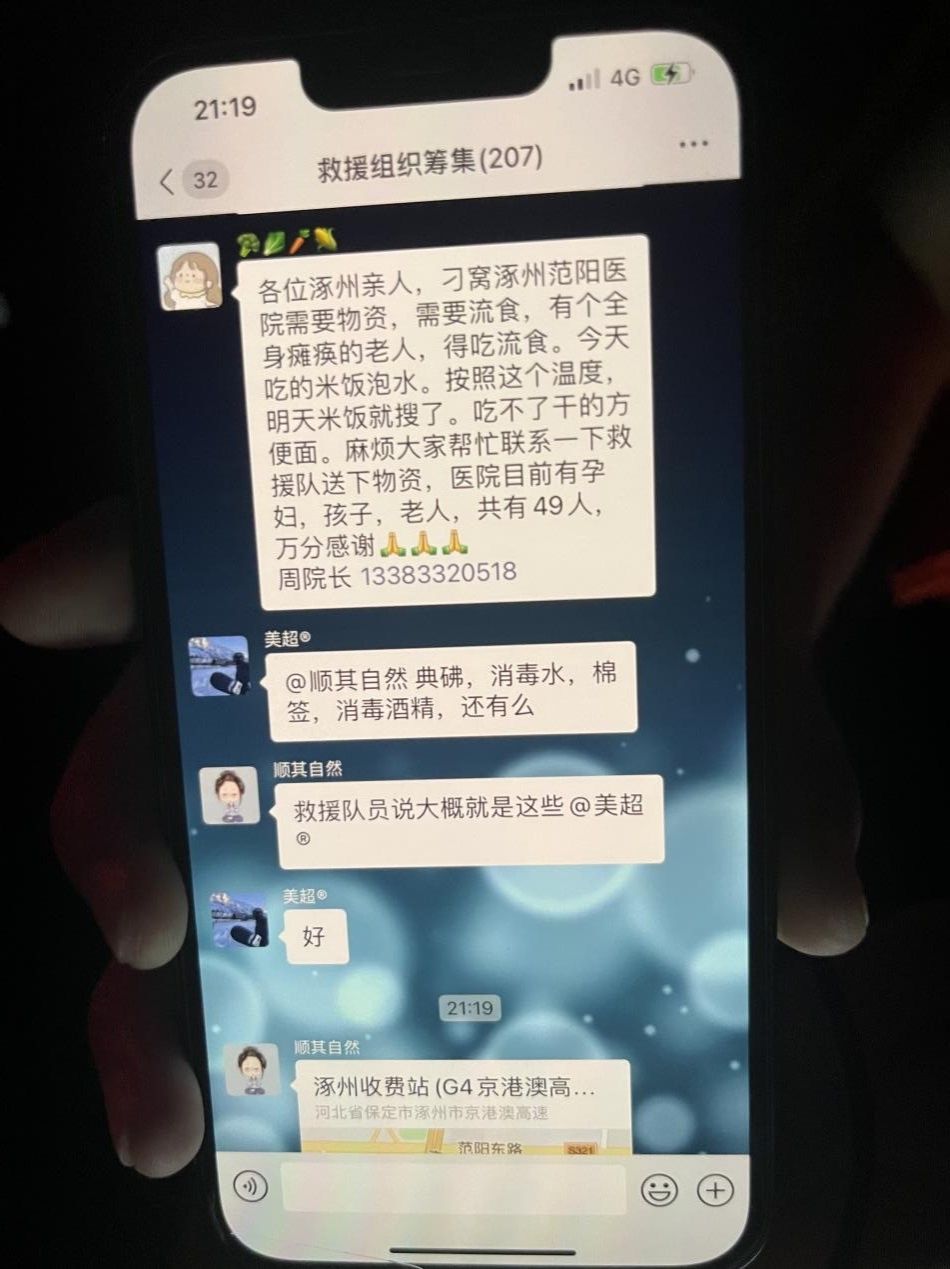 下高速后,我担心没有救援队愿意接收我。一开始我们收到了涿州范阳医院的求救信息,有49名老人和孕妇被困,但是当地水非常深,而且水流湍急。
