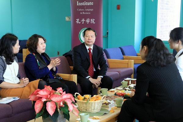 在代表团与孔院教师和志愿者的座谈中,代表团详细了解了孔院的招生情况、开设的课程、使用的教材、学生的学习需求和开展文化活动等情况,对麦大孔院的工作提出了很多宝贵的意见,特别是向孔院推荐了兄弟孔院使用的一些针对华裔生的优秀教材。陈丽霞处长向教师和志愿者传达了孔子学院总部对汉办奖学金申请、暑期培训和本土教师培训等方面的要求。座谈最后,赵旻副校长对孔院教师和志愿者提出了三点希望:第一、要发扬团队精神,充分发挥各自的创造力,努力满足当地的汉语和文化学习的需求;第二、孔院是座金矿,要学习、了解、研究孔院,充分发掘和利用孔院的资源开展工作,注意总结工作规律,积累经验,并将自己的经验与其他教师及志愿者共享;第三、要树立良好的形象,在工作和生活中充分展现孔院教师和志愿者优秀的精神风貌。