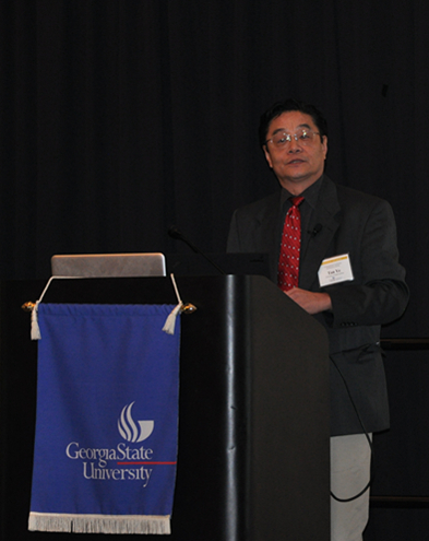 八点半左右,研讨会正式开始,佐治亚州立大学孔子学院美方院长顾宝桐教授和佐治亚州立大学副教务长刘骏教授先后致欢迎辞。顾院长首先对从全球各地远到而来的参会人员表示热烈欢迎。他指出,2010年和2011年,英国伦敦商务孔子学院和丹麦哥本哈根商务孔子学院分别主办了第一届和第二届商务汉语教学国际研讨会,无论从商务汉语国际教育的推广、商务汉语人才的培养还是从中外商务合作跨文化交际的发展等方面都起到了重要的作用。为了继续扩大商务汉语教学国际研讨会的重要影响力和推动商务汉语教学进一步发展,佐治亚州立大学孔子学院积极筹办了此次会议。刘骏教授指出,商务汉语国际教育、商务汉语人才的培养和中外商务合作跨文化交际的发展,在当今经济全球化的时代显得尤为重要。此次商务汉语教学国际研讨会将为各位参会人员搭建交流和沟通的平台,同时促进商务汉语教学的进一步发展。