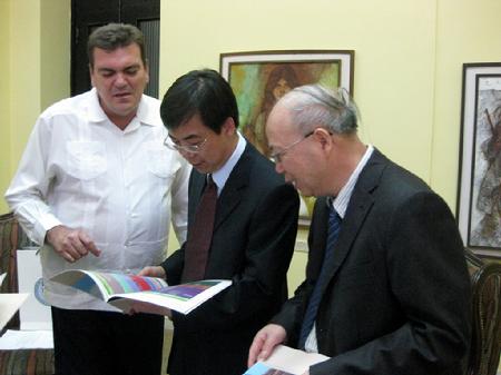 北语代表团一行还先后与哈瓦那大学Gustavo Cobreiro校长、三位副校长、多个部门及孔子学院有关人员就两校合作、孔子学院未来发展、部分预算项目及目前面临的一些问题等进行了深入的会谈,并向哈瓦那大学校长递交了参加北语建校50周年的正式邀请函。代表团还亲切友好地慰问了孔子学院的全体师生。曹志耘副校长非常关注孔子学院的奖学金申请工作,同时也对孔子学院的科研发展给予了指导,并对两校的科研合作寄予希望。访问期间,代表团拜会了中国驻古巴新任大使张拓,并受到使馆领导高规格的接待。