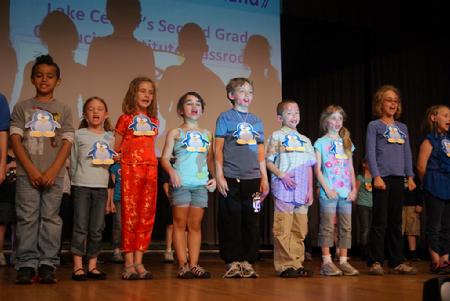 Lake Center小学的节目是“小企鹅回家”。七个可爱的企鹅宝宝在睡梦中来到了别的大洲,他们遇到了当地的动物,了解了不同地区动物的生活习性。最后他们来到了亚洲,和熊猫一起表演说唐诗、唱中国歌、表演中国功夫。老师们巧妙地把舞台当作课堂的模拟,孩子们在这个大课堂上用汉语学到了丰富的知识。当孩子们用字正腔圆的汉语介绍大洲知识、吟诵唐诗时,真难想象他们才学了一年多汉语。孩子们在舞台上表演的翻跟头等硬功夫,也让台下的家长们不断喝彩。