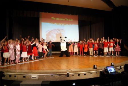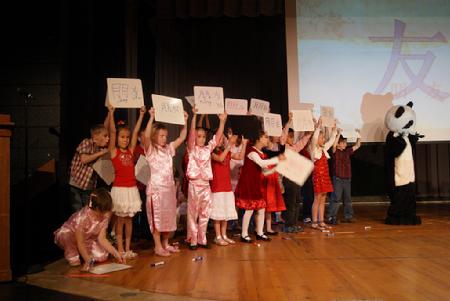 Amberly小学的节目主题是“找朋友”。孩子们在梦幻般的世界中遇到了中国的大熊猫,他们和熊猫一起来到了中国的长城,和熊猫一起打太极拳、写汉字、做数字操、唱唐诗……孩子们在家长们一阵又一阵热烈的掌声中拉着熊猫的手走遍虚拟世界,大声说:“我们是朋友!”汉语已经不仅让中美两国人民的友谊走进孩子们的心中,还让孩子们感受到世界和平的美好。