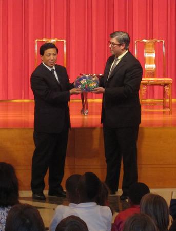 表演结束后有中国文化互动游戏环节,小朋友们纷纷去寻找自己感兴趣的部分,有的练习武术,有的写毛笔字,有的练习用筷子将小球,还有的跟京剧演员合影留念。本次活动取得了圆满的成功,家长和老师们纷纷表示不虚此行,收获颇多。活动后张业遂大使与博仁小学校长互换了礼物,博仁小学孔子课堂的小朋友们也给张业遂大使准备了一个他们亲自手工制作的“万里长城”作为礼物,张大使看到这个礼物感到非常高兴。整场活动充满欢乐气氛,互动热烈。美国小学生纷纷表示他们在中国使馆过得很快乐、难忘,教师和家长代表表示此次“使馆开放日”活动对他们增进对中国的了解非常有益。
