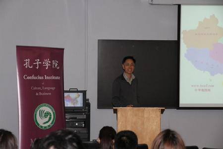 2011年11月11日,应麦克马斯特大学孔子学院的邀请,麦克马斯特大学材料工程系许谷教授在HealthScienceComplex1A4室为大家带来了名为“游遍中国”的精彩讲座,此次讲座也是本学期麦克马斯特大学孔子学院主办的卓越演讲者系列讲座的第二讲。麦大孔院中方院长成敏博士主持了此次讲座,40余名本校学生及教授前来参加了此次讲座。