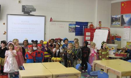 仪式由博仁小学业务主管DeniseDiggs女士和家长教师委员会主席TobieMeyer-Fong女士共同主持。仪式上,博仁小学2年级的小朋友们表演了汉语朗诵和歌曲联唱。天真烂漫的小学生们身着各式童话服装,虽然声音稚气未脱,但汉语发音吐字却清晰准确,博得了观众们的阵阵掌声。