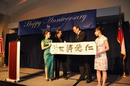 据悉,当晚应邀参加GSU孔子学院周年庆典的贵宾有一百多位,涉及亚特兰大政界、商界、教育界等多个领域,其中包括来自UPS的代表LisaWallace女士、全美华人协会资深顾问马崇铮先生、中华专业人士协会副会长顾菊林先生以及佐治亚州立大学的教授代表等。此外,出席周年庆典的还有埃默里大学(EmoryUniversity)孔子学院院长蔡荣博士、肯尼索州立大学(KennesawStateUniversity)孔子学院院长金克华博士等来自兄弟孔院的代表。