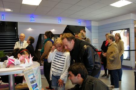 为了配合首映式,孔子学院的老师们在电影院前厅摆起了中国书法和中国手工折纸宣传台。中国的传统折纸引起了法国朋友的浓厚兴趣,尤其是千纸鹤、乌篷船等具有祝福意义的手工艺品,代表着中国人民对世界和平的祈望和祝愿。在展览桌前悬挂的中国地图,标出了这次电影中事件的发生地——中国南京。一位带着女儿前来看《拉贝日记》的法国父亲说,之所以带孩子来,是因为孩子的爷爷是在这个城市附近出生的,而那时却正是烽烟四起的年代,所以带女儿来了解一下当年的战争岁月和她爷爷曾经出生的国度里发生的故事。
