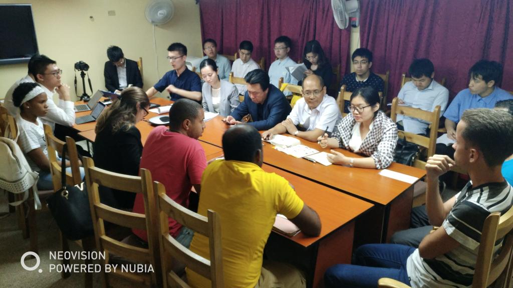 下午,学生团在孔院中方院长的陪同下访问了哈瓦那大学并与哈瓦那大学党委、共青团及大学生联合会成员举行了座谈。哈瓦那大学党委书记古铁雷斯Ayuban Gutiérrez、共青团书记卡罗Juan Carlo、国际处副处长玛丽安Marien Lledó出席了座谈会。与会双方就大学生服务社会的理念和制度,马克思主义理论在中古大学体制下的开课情况,大学生联合会与青年团的活动组织情况,以及古巴共产党与宗教的关系等问题进行了多方面多层次的交流探讨。