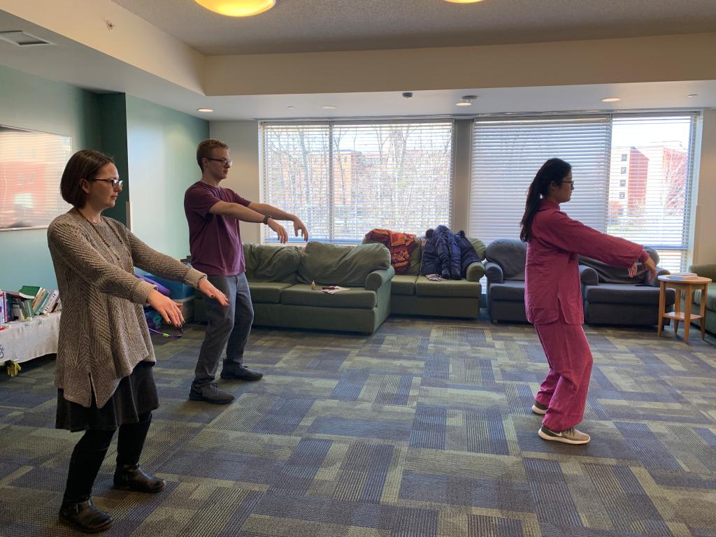 两位老师先对孔院的文化项目,尤其是太极拳进行了简单的介绍,然后开始二十四式简化太极拳的演示。第一次近距离地欣赏太极表演,学生们非常认真,边看边跟着比划。接着进入教学环节,从动作要领,精神集中点到呼吸。孔院老师们尽力将太极拳的动作和精髓都解释清楚,寻找其与正念课程的共同点。