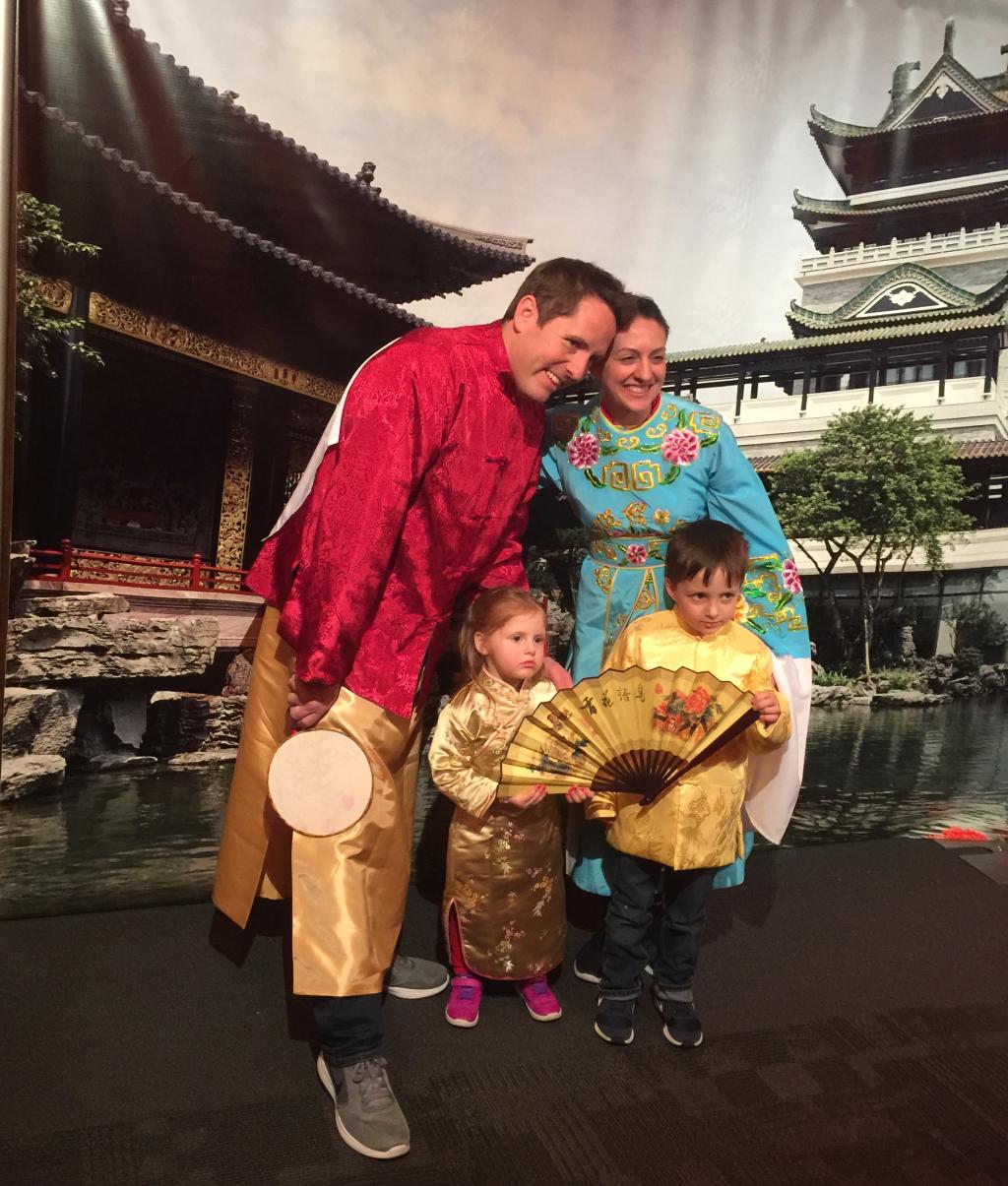 来自弗吉尼亚阿灵顿(Arlington County in Virginia)的马克(Mark)一家四口都贴上了各自的生肖贴,爸爸属羊,妈妈属鸡,六岁的姐姐属龙,两岁的弟弟属马,而妈妈指着高高隆起的腹部要求为即将出生的宝宝也贴上一片可爱的小猪生肖贴,表示“一个都不能落下”。