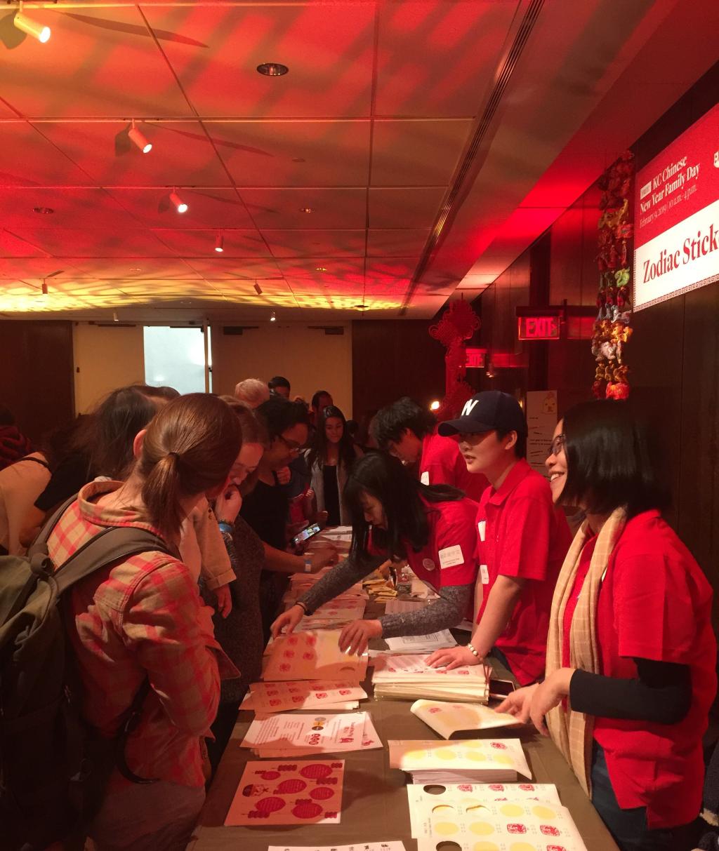 当日的活动现场,一片喜庆温馨的“中国红”,充满了欢快热烈的节日气氛。活动设有制作红灯笼,脸谱涂色,猪年生肖面具,幼狮提线木偶,书法留名,传统服装试穿等体验活动,每个展台前都排满了欢笑的市民家庭。由广州艺术团专程带来的空竹表演,广州戏服试穿以及广彩绘制互动活动更是让市民惊叹不已。梅森孔院带来的生肖贴位于入口处,参与度极高。孔院的志愿者老师们热情地为参与者找出他们的生肖,幸运数字和幸运色,并贴上生肖贴。