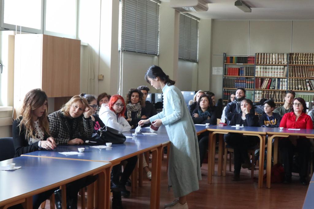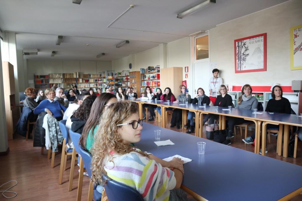 活动一开始,TOSI高中的多娜老师便用意大利语向大家讲解“茶”这个汉字,然后介绍了神农尝百草的故事,引起了意大利孩子和家长们的兴趣。“茶圣”陆羽及他的作品《茶经》,宋朝时兴起的“斗茶”活动,茶的具体发展历史等等,一系列的文化内容将大家带入了那个幽香的“茶世界”。
