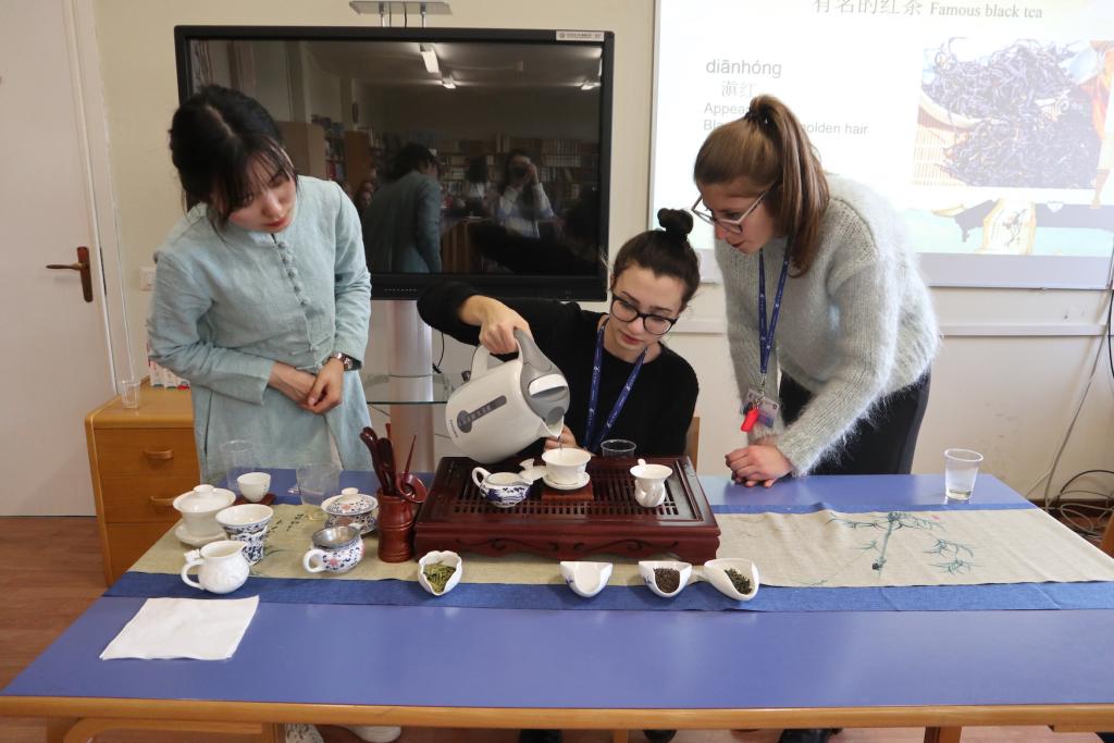 孔院的张潇雅老师,早早地布置好了茶器,教室里也正播放着《渔舟唱晚》,等待学生及家长们前来,共品佳茗。