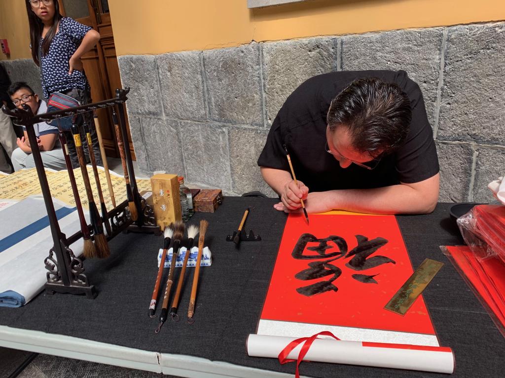 之后,孔院教师们带着大家写福字。此次活动还邀请了阿兰来展示书法。9年前他曾是墨国大孔院第一位获得奖学金来华留学的学生,目前在中国深圳工作。虽然书法只是他的业余爱好,但他已多次在中国的书法比赛中获得大奖。此次他满怀感激之情,特地来孔院进行书法表演,还把多年收藏的文房四宝以及他的众多作品都拿到了孔院,展示给学弟学妹们,也使孔院也更具有了年味。