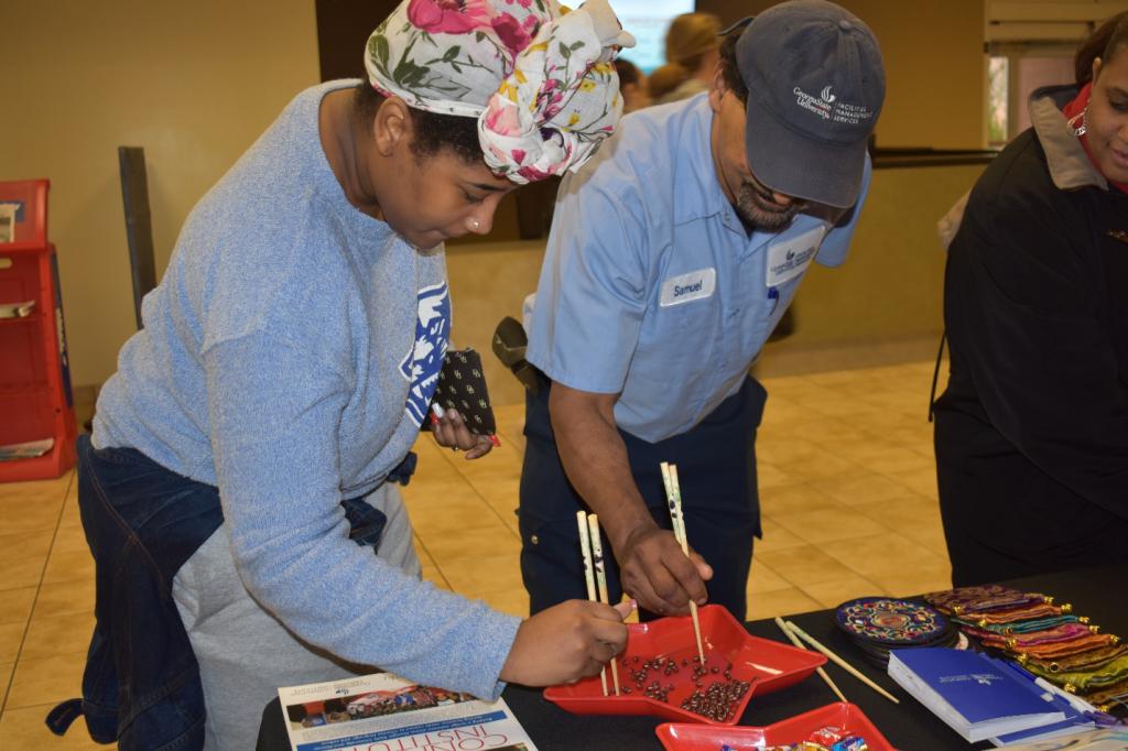 夹豆子比赛中,师生挑战自我,拿起中国的筷子,与孔院工作人员、参与本次庆祝活动的同学比拼速度。不少同学在挑战之后表示以后到中餐馆吃饭可以使用筷子了!