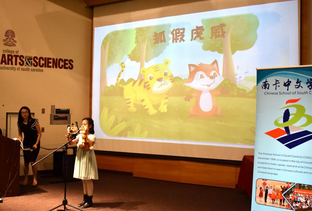 故事在民族文化中具有非常重要的地位和作用,很多民族都是通过讲故事来了解、学习并传承本民族文化的。南卡中文学校的这些华裔孩子也不例外,他们虽然生在美国、长在美国,但是通过学习中国故事,他们生命中中国文化的基因就得以成长与传承。比赛中,孩子们分别讲述了“狐假虎威”、“塞翁失马”、“神笔马良”、“盲人摸象”、“守株待兔”、“掩耳盗铃”和“小马过河”等中国传统的寓言或童话故事。为了讲好故事,小选手们精心准备了各种道具。例如张书畅小朋友在讲述“盲人摸象”时,自己准备了一副墨镜戴上,以模仿盲人;并用纸板做成了大象身体的不同部位。每讲到一位盲人所摸到的大象部位时,就把纸板做的相应部位贴在自己准备的小白板上,故事讲完了,完整的大象也在白板上呈现了。真是生动活泼,绘声绘色。最终,马慧伊同学在18位选手中脱颖而出,获得了“讲小故事比赛”的第一名,成为南卡中文学校的“故事大王”。