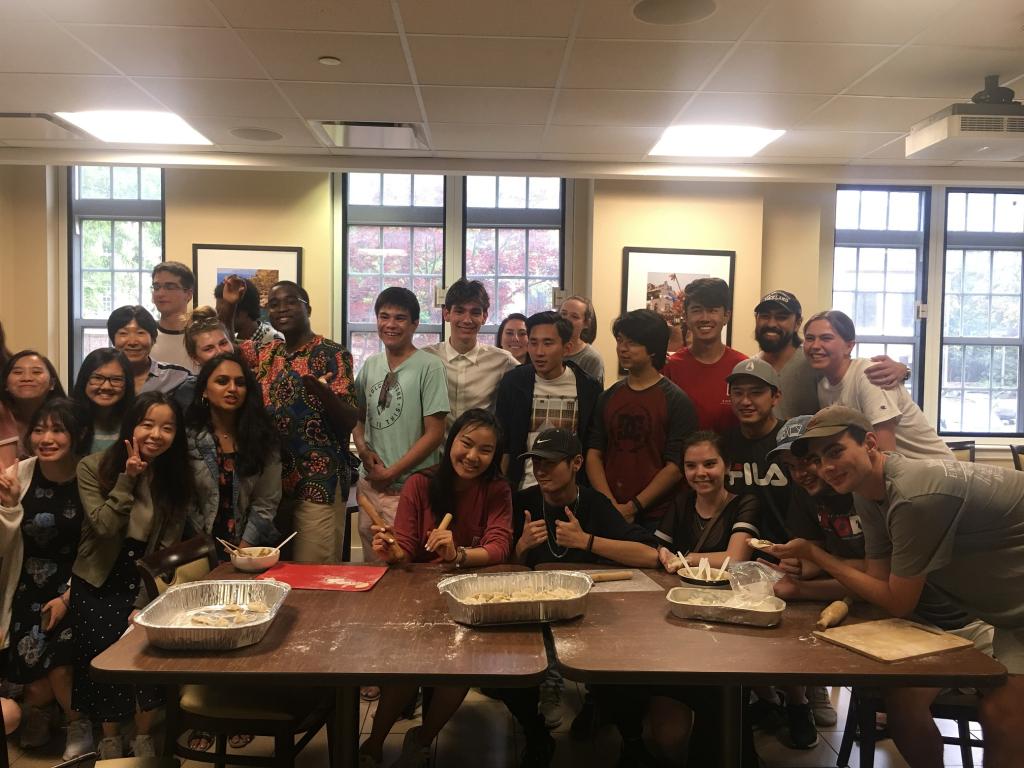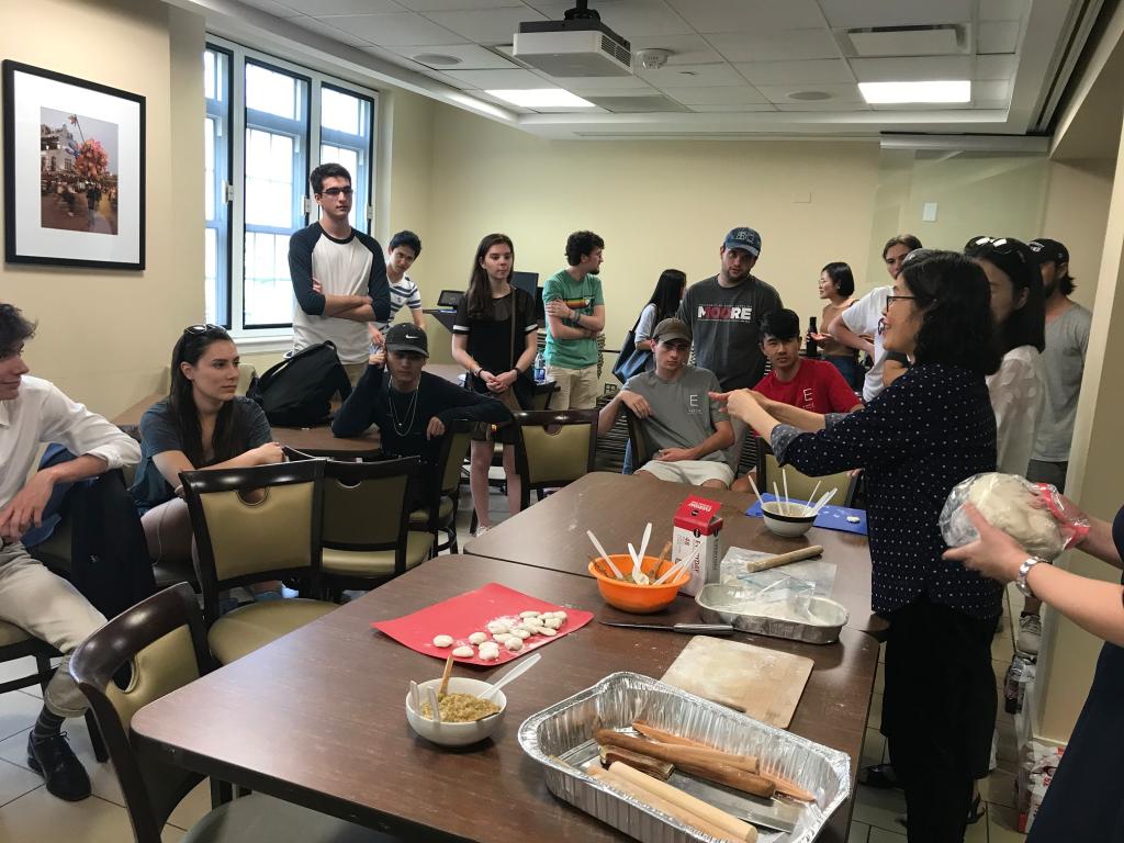 活动当天阴雨连绵,却挡不住大家参与的热情,活动尚未开始,已经有学生纷纷抵达现场。大家看到桌上摆好的饺子馅料和面团,热烈兴奋地讨论即将开始的活动。活动于下午五点正式开始,李越院长首先对大家的到来表示欢迎,简要向大家介绍了饺子的原料和制作方法,以及中国人吃饺子的习俗;接着便亲自上阵,示范讲解如何擀皮和包饺子。