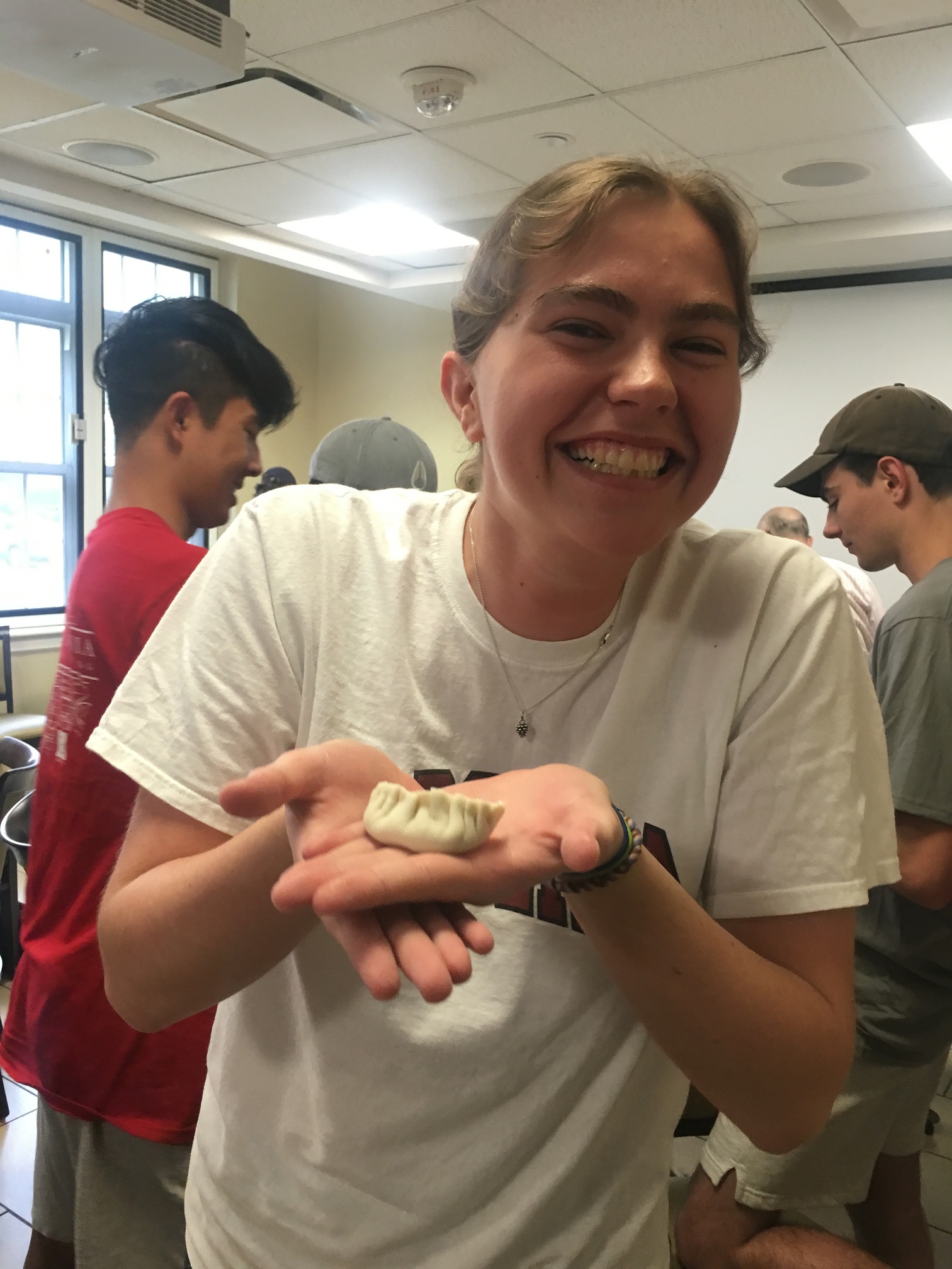 随后,大家分成三个小组,每个小组由一名孔院教师带领,兴致勃勃地开启了包饺子的体验。有的学生对着软软的饺子皮无计可施,急得满头大汗;有的学生则颇具天赋,包出一个个形状各异的创意水饺。大家一边包一边兴奋地向他人展示自己的“作品”,倍感自豪。不少学生说,包饺子就如同学汉语,一开始不熟练,总是出错,但通过练习便越来越熟练。