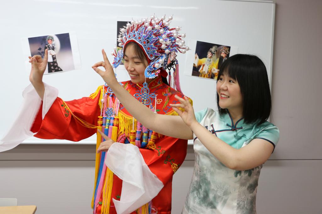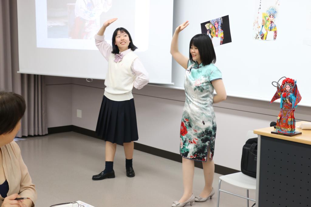 讲座伊始,主讲老师先为大家简单介绍了中国京剧的基本知识。京剧是中国传统戏曲之一,享有中国国粹的声誉。京剧有“唱、念、做、打”四大基本功和“生、旦、净、丑”四大行当。旦行中最有名的表演艺术大师当属梅兰芳先生,他创立了“梅派”,曾在日本、美国、苏联进行了京剧的海外公演,大获好评。接下来,主讲老师还向大家介绍了京剧中的代表性手势“兰花指”,并以开门的动作为例,请在座的高中生跟随老师一起模仿京剧动作,一颦一笑,一举手一投足,尽显文化底蕴。京剧根据人物身份、性格的不同,还有各种各样的脸谱。