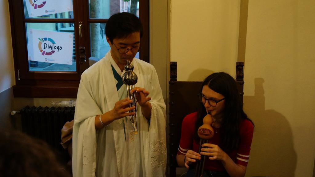 陈镜伊老师着一身素白汉服,为大家演奏起葫芦丝,悠扬的乐曲好像将大家带到了遥远的西双版纳,表演结束后,观众仍感觉余音绕梁,沉浸其中。于是大家纷纷向陈老师讨教如何吹出优美的《月光下的凤尾竹》,陈老师也耐心地对大家进行指导。