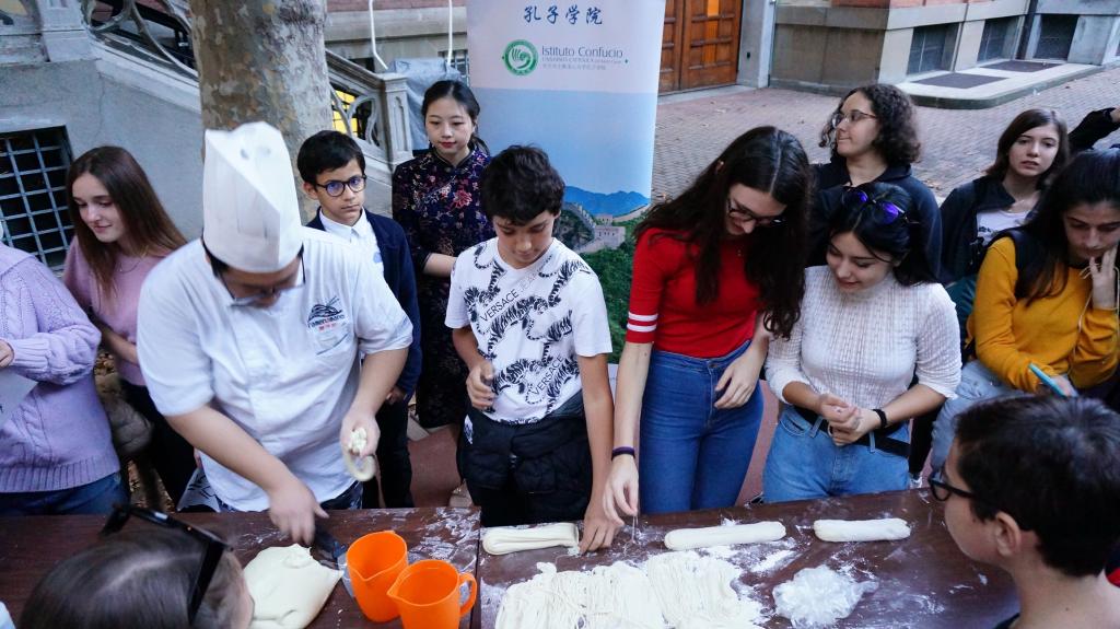 下午16:45,中国传统美食——拉面技艺表演准时开始。拉面是中国北方城乡独具地方风味的一种传统面食,兰州牛肉拉面尤其受广大面食爱好者欢迎。但拉面不仅仅是简单的拉抻,为展示最传统的拉面艺术,圣心孔院特地邀请了米兰最著名的拉面馆的胡师傅。只见普通的面团在胡师傅的拉拉拽拽下仿佛活了起来,伴随着胡师傅各式各样的动作,面团时而如银蛇狂舞,抻细后在他的抖动下又如惊涛骇浪,令人拍案叫绝。最终,一根根细细长长的面条展现在观众眼前,学生维罗妮卡(Veronica)表示:“我特别喜欢中国美食,最喜欢吃拉面!没想到做拉面这么复杂,但却这么有意思!”