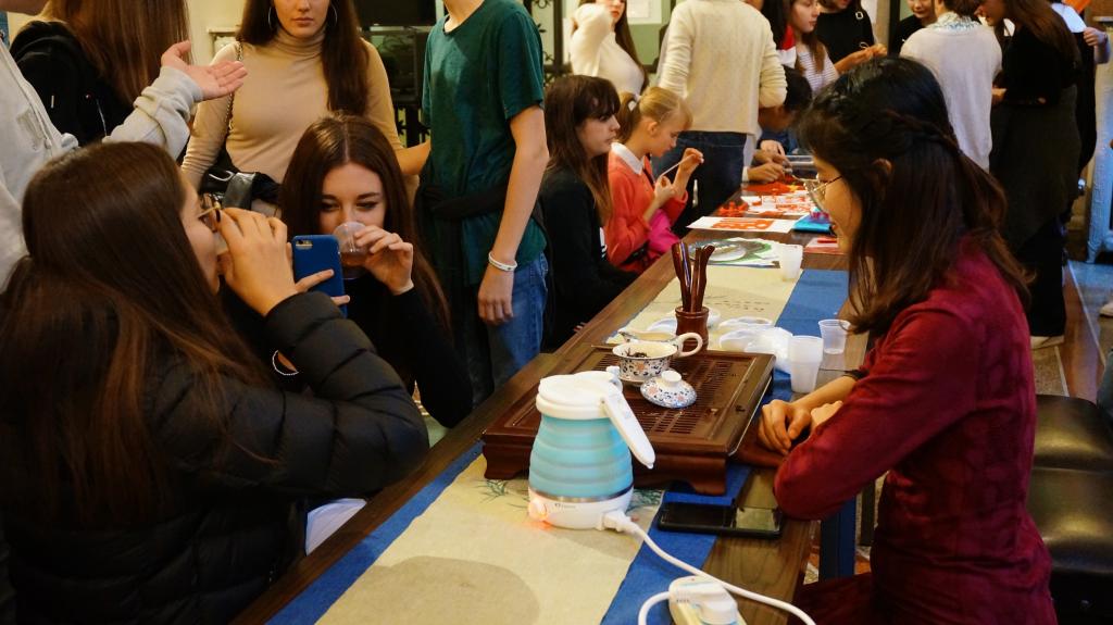 张晨莲老师和李佳薇老师负责的茶艺展台也深受大家欢迎。两位老师耐心地给大家讲解中国六大茶类的起源和分类,随后讲解和示范泡茶和奉茶的礼仪。而观众早已按捺不住,争先恐后地坐到茶席上自己泡茶、品茗,还兴奋地把自己的“成果”分享给同行的好友。