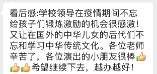 联欢会中,一个特别的节目是来自中文二班的方清墨小朋友,他读了一封写给罗老师和同班同学的信,令人动容。在信中,他回忆了曾经在教室中与同学们上课的点点滴滴,并在最后用稚嫩的声音问罗老师:“您觉得我的中文有进步吗?”简单的话语,足足打动每一位在场老师们的心。是啊,我们有多久没有在曾经的校园见面?又有多久没有在熟悉的教室上课?只字片语中,流露出真挚的思念。思念化雨,滋润孤独的心灵;思念化风,吹散阴霾的烦忧;思念化雪,沁透无尽的等待;思念化光,照亮似锦的前程!我们相信,并坚信,相聚不久就会到来!